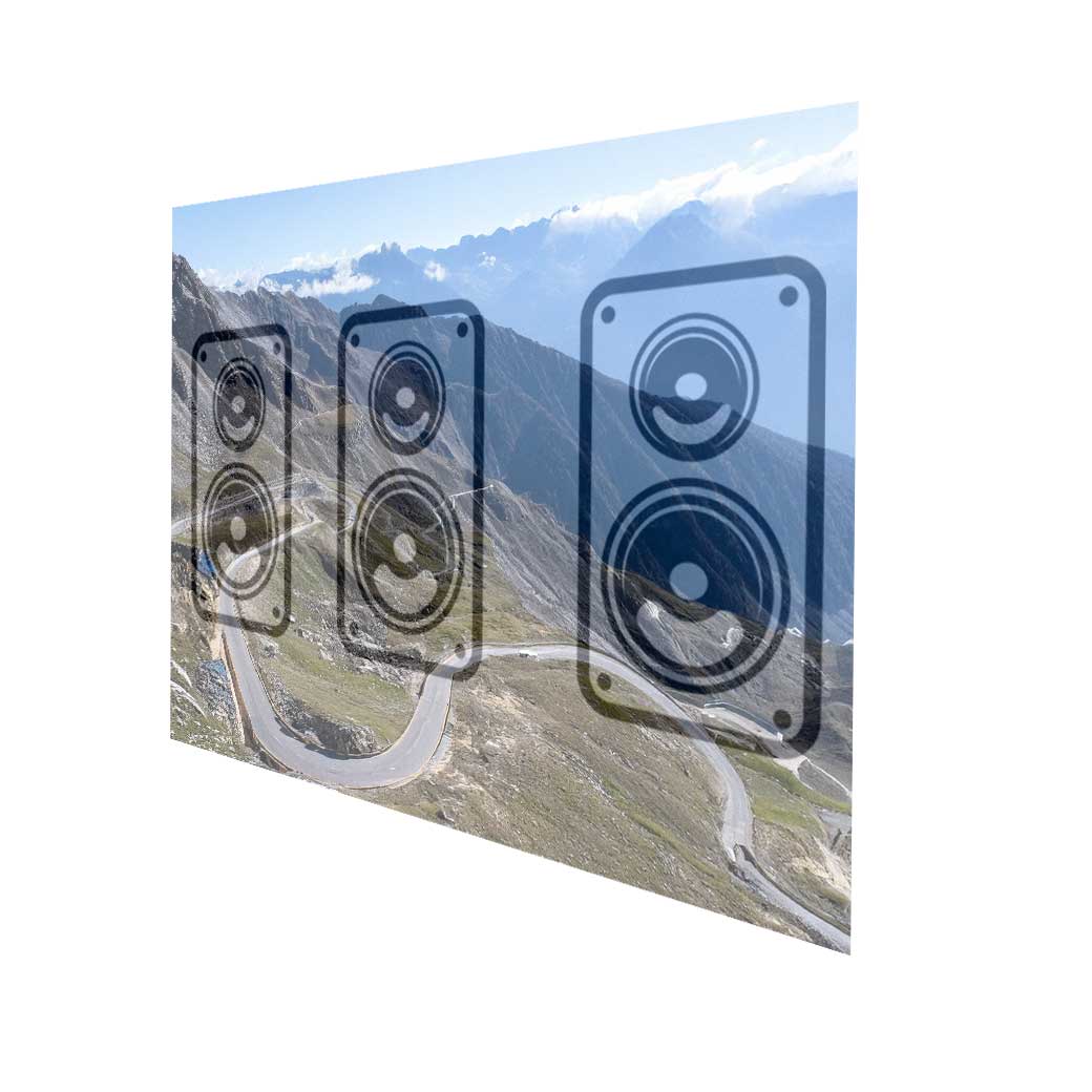 Mount your speakers behind the screen and allow the micro-weave to let the sound thru. This allows you too have the perfect LCR setup in regards to tweeter height and sound projection.