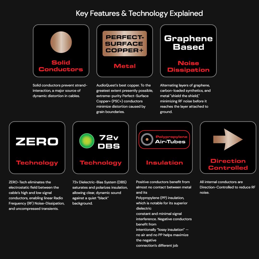 Radio-Frequency Noise from cellular, WiFi, and satellites is everywhere. AQ’s Level 6 Linear Noise-Dissipation includes a carbon & graphene resistive mesh-network, direction-controlled conductors, and Silver-Plated drain wires. These significantly help minimizing RF Noise masking effects.