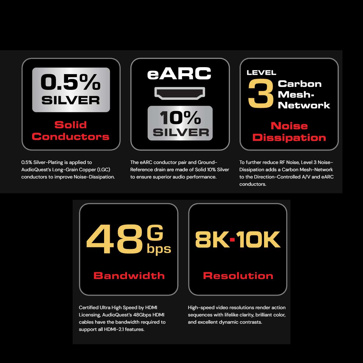 The AudioQuest Vodka eARC Priority HDMI Cable is a Ultra High Speed 48Gbps HDMI 2.1 Cable and features 10% Silver eARC conductors and 5% Silver Ground-Reference conductors with Level-3 Noise-Dissipation.