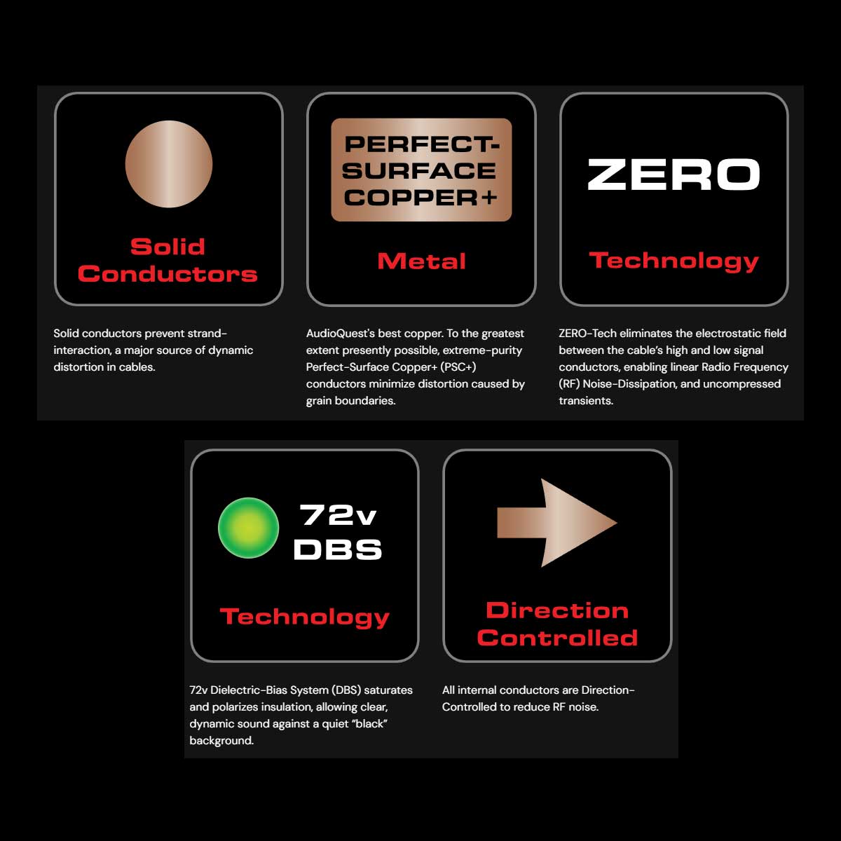 All drawn metal strands or conductors have a non-symmetrical, and therefore directional, grain structure. AudioQuest controls the resulting RF impedance variation so that noise is drained away from where it will cause distortion.