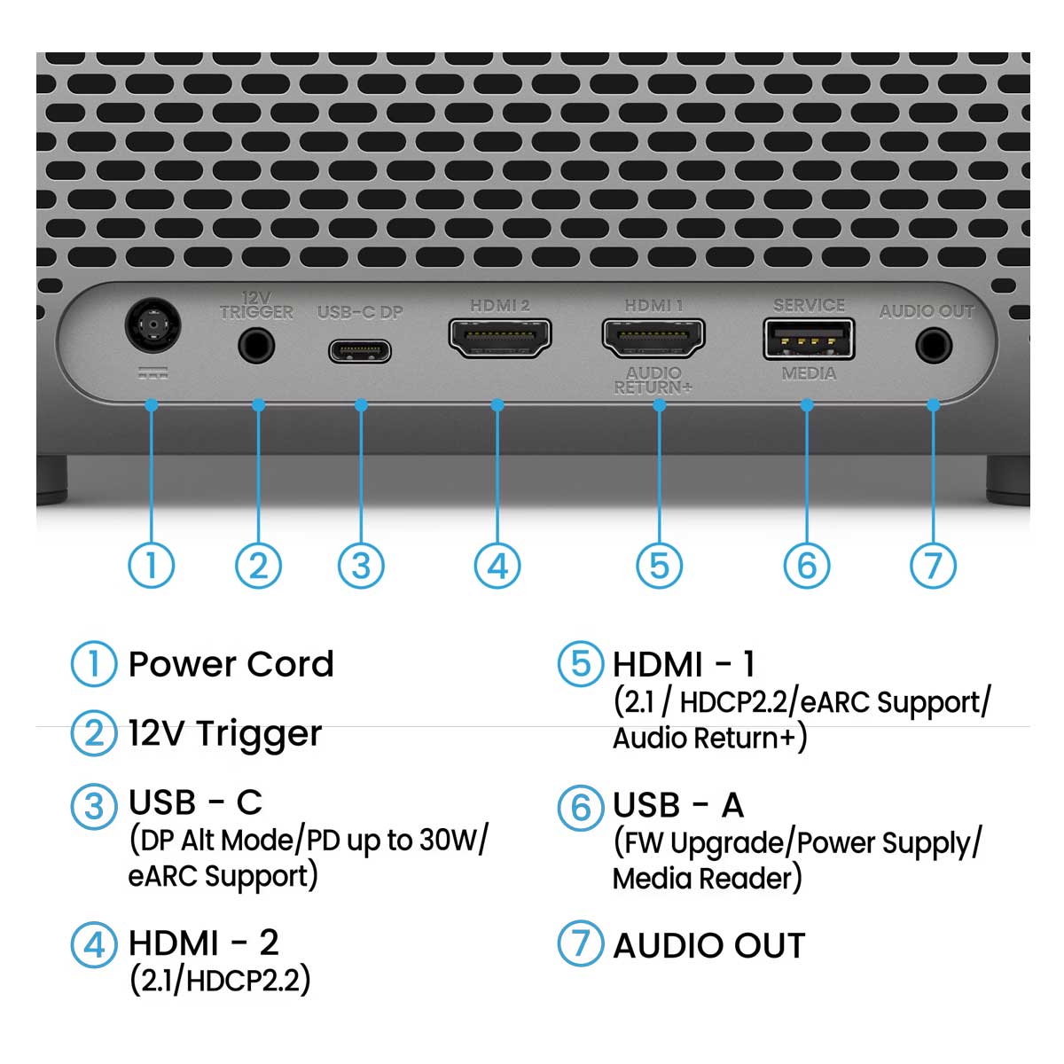 - HDMI in: HDMI-1 (2.1/HDCP2.2), HDMI-2 (2.1/HDCP2.2), (x2)