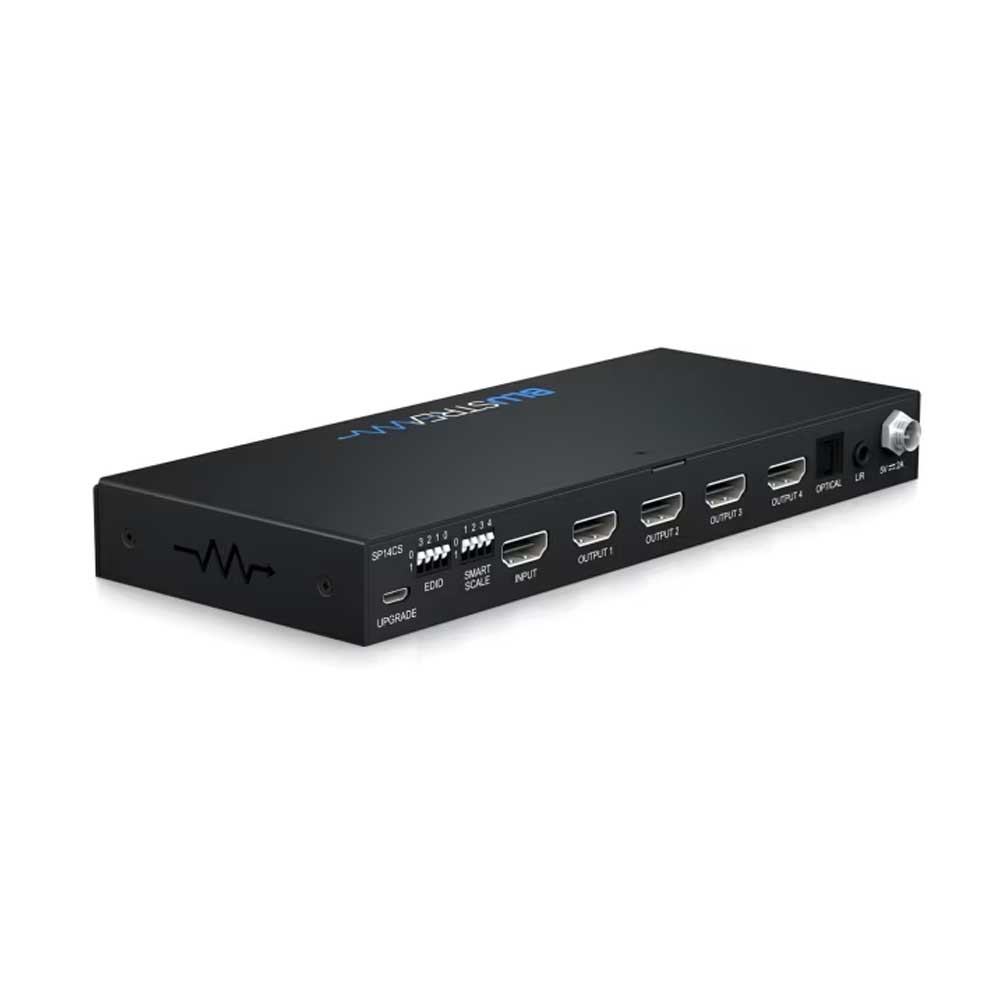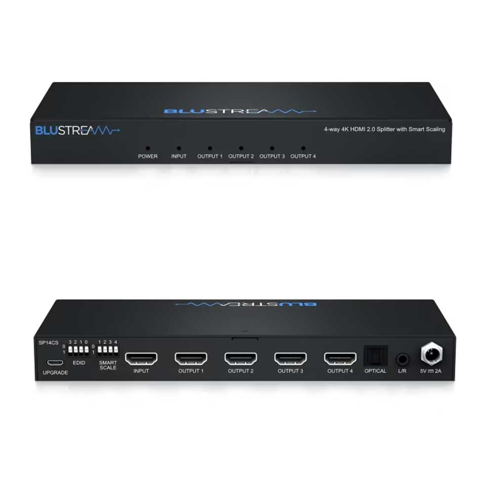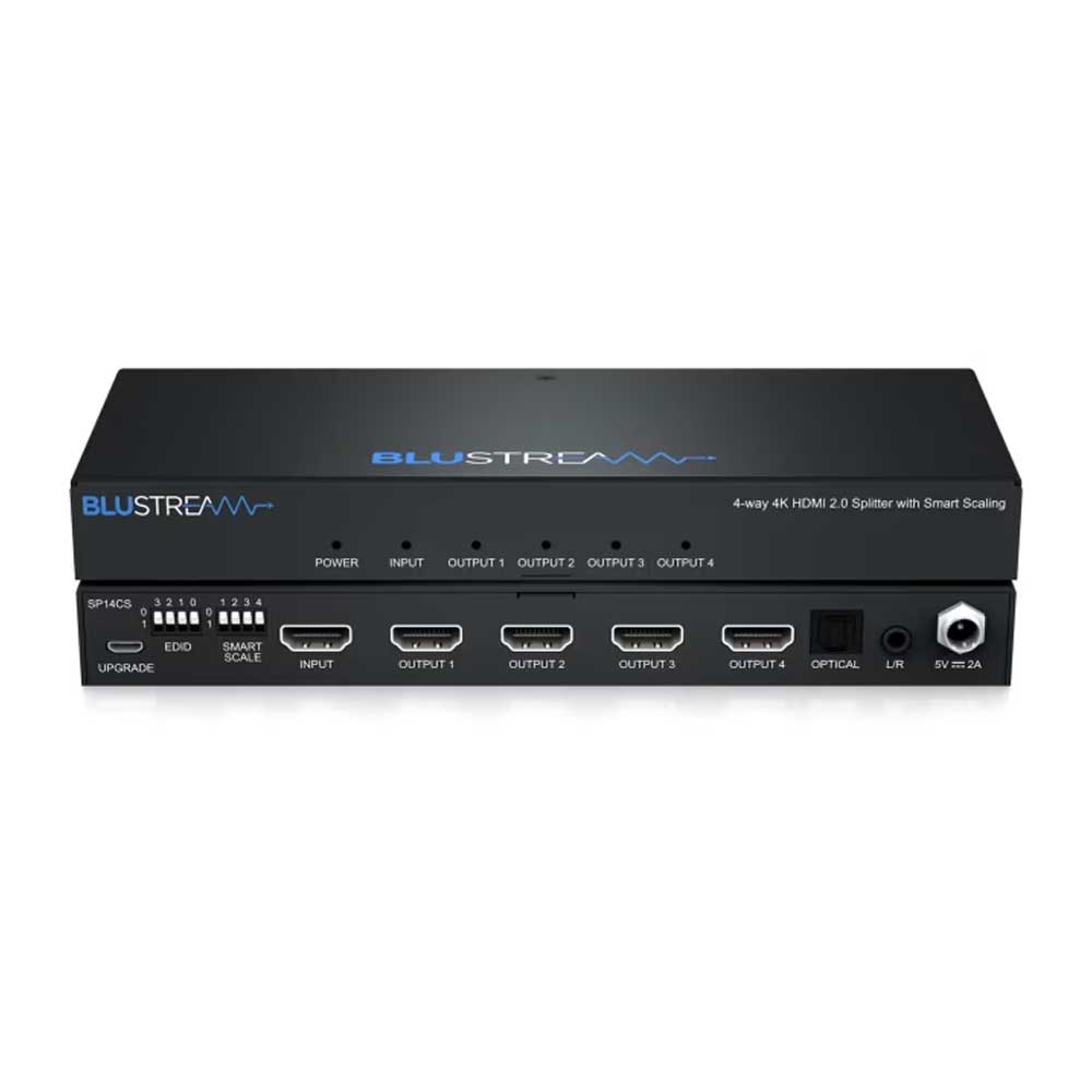 The Blustream SP14CS 4-Way 4K HDMI 2.0 HDCP 2.2 Splitter distributes a single HDMI source to four displays with full 4K60 Hz video clarity and reliable HDCP 2.2 support.