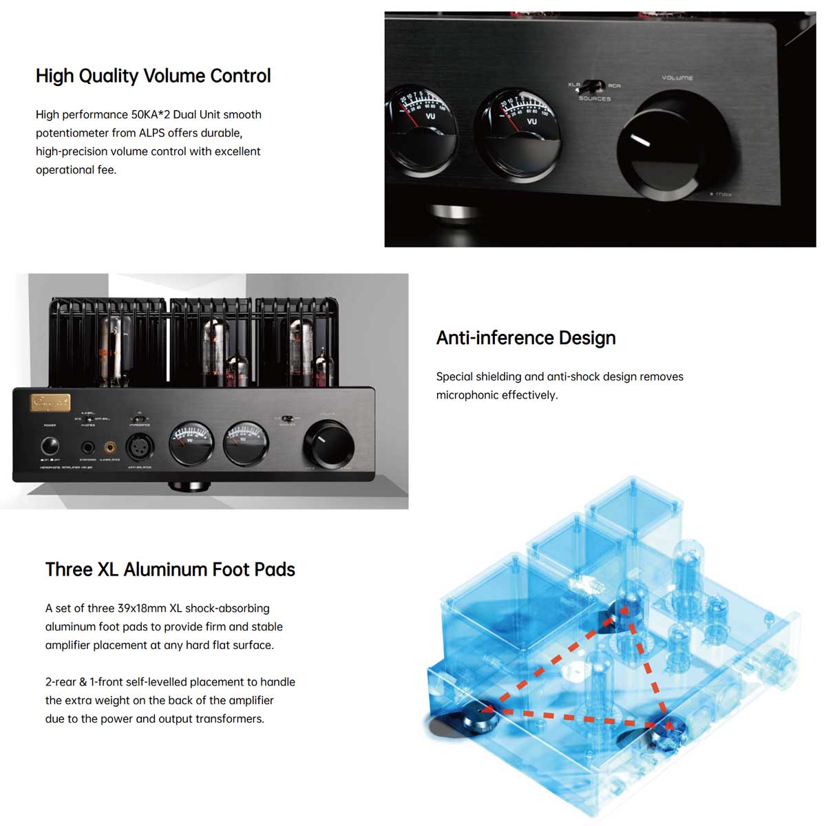 The use of 6V6 output tubes gives the amplifier a beautifully smooth tonal character with excellent midrange richness and natural timbre. Vocals and acoustic instruments sound particularly lifelike, while the amplifier still maintains excellent clarity and detail retrieval. Its Class-A single-ended topology ensures low distortion and a smooth, fluid presentation that tube enthusiasts will immediately appreciate.