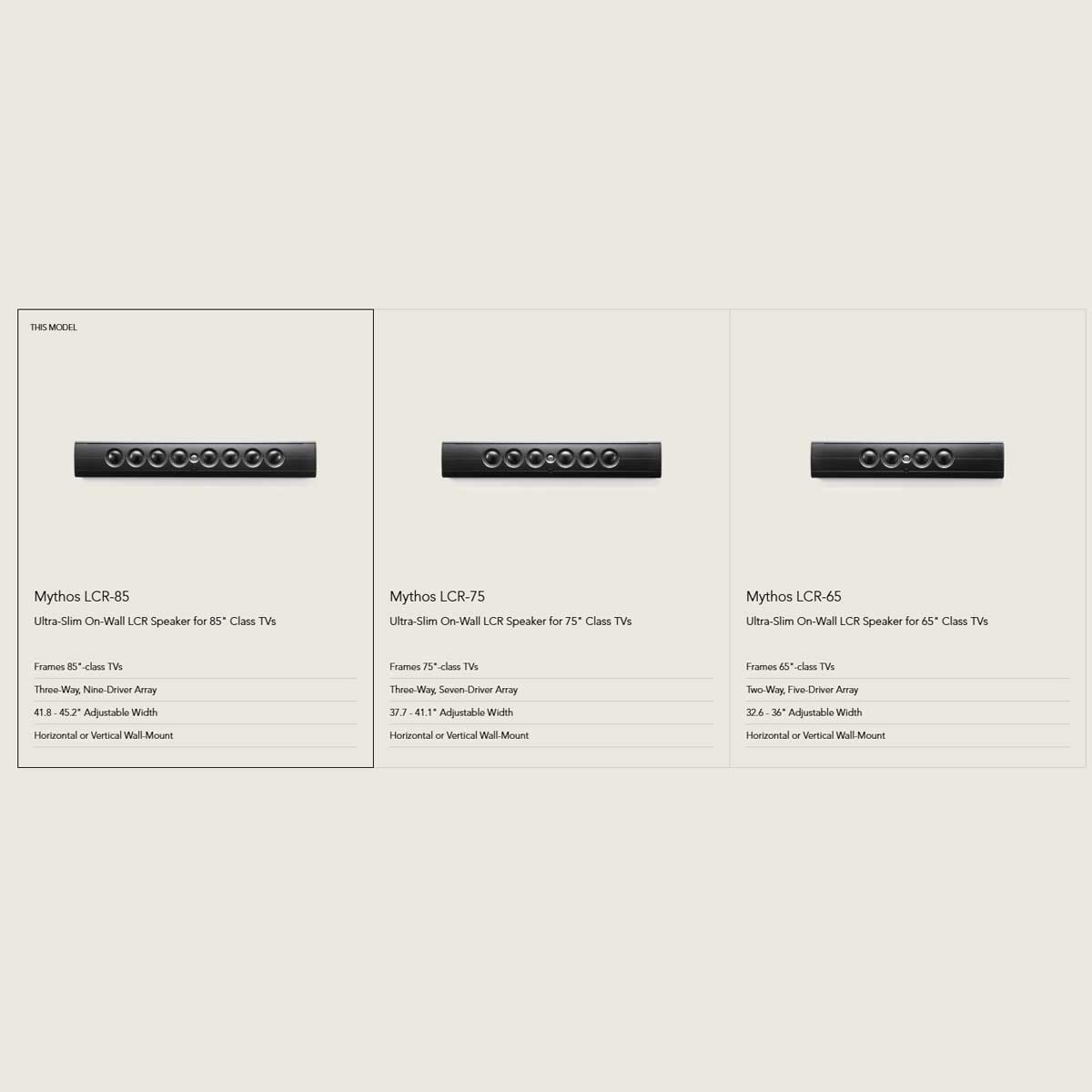 The Definitive Technology Mythos LCR Ultra-Slim On-Wall Speaker is an ultra-slim, two-way LCR speaker for 65”, 75″ 7 85″ class TVs.