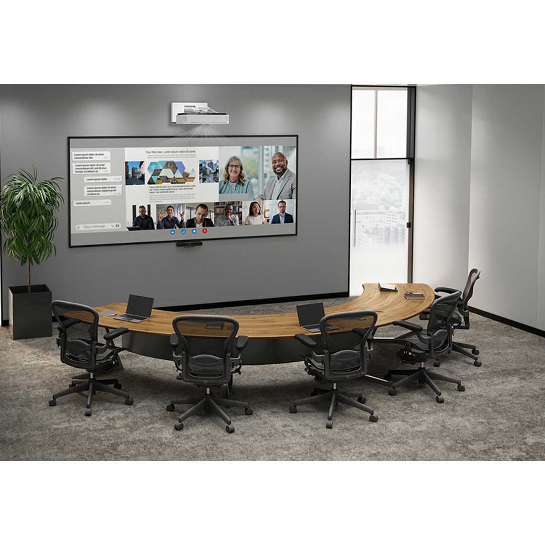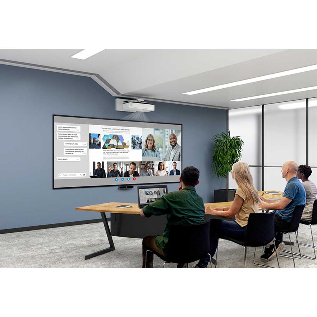Its ability to produce a large, bright Full HD image from just centimetres away makes it ideal for small meeting rooms, huddle spaces, and collaborative work areas where wall space is limited.