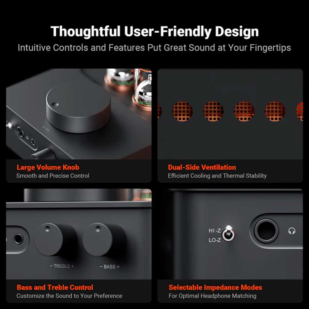 - User-Friendly Design: This tube headphone amp preamplifier offers intuitive controls, including a large volume knob, dual-side ventilation holes, bass & treble controls, high and low impedance mode switching, making it versatile enough