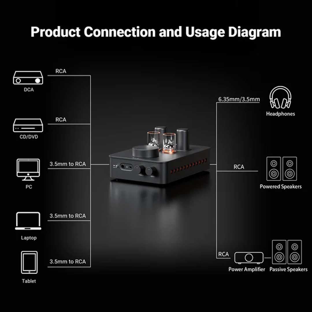 - Two-in-One: It supports low and high impedance modes switching to adapt 16Ω-300Ω headphones, and features 6.35mm/3.5mm headphone jacks on the front and RCA Input/Output on the rear for home audio HiFi system integration