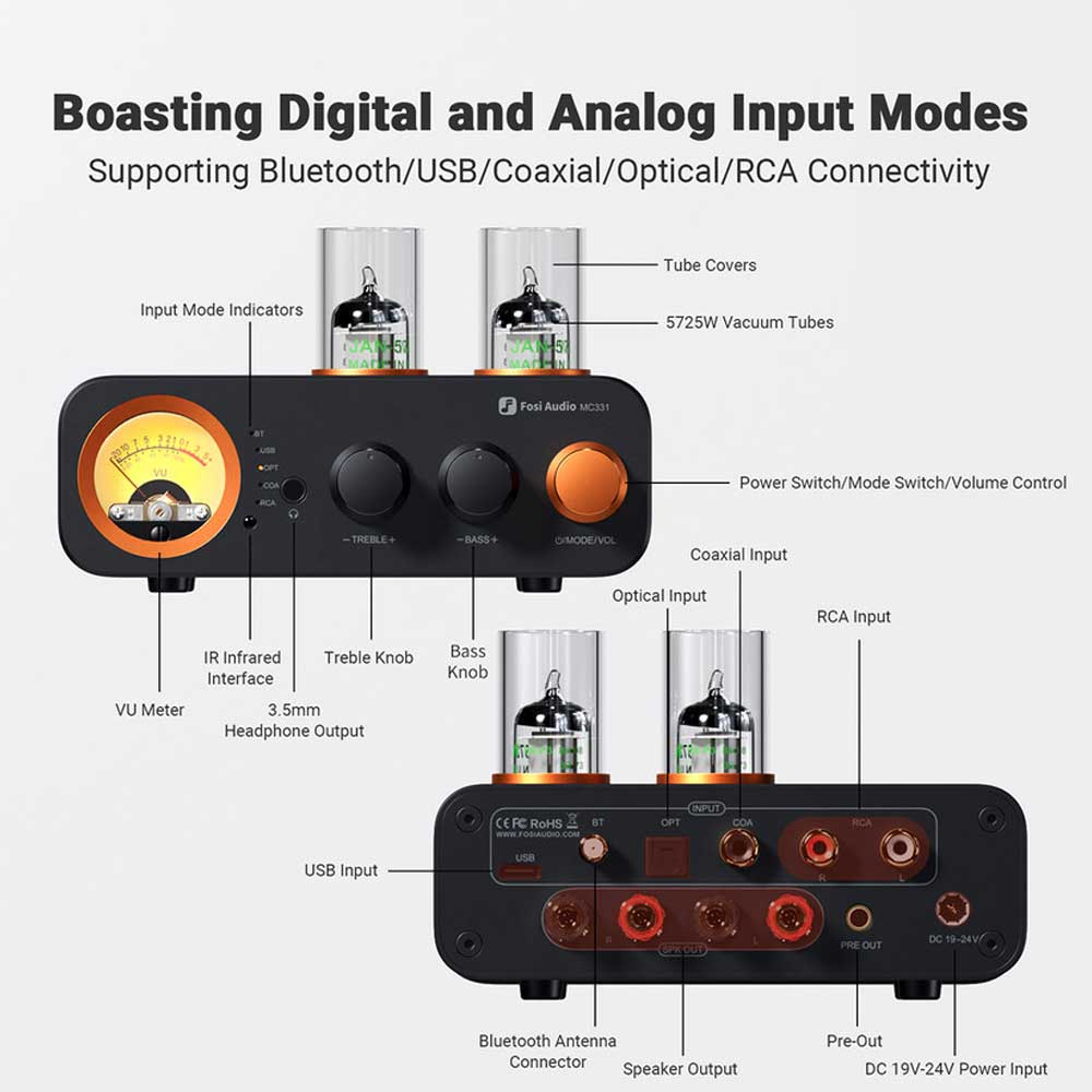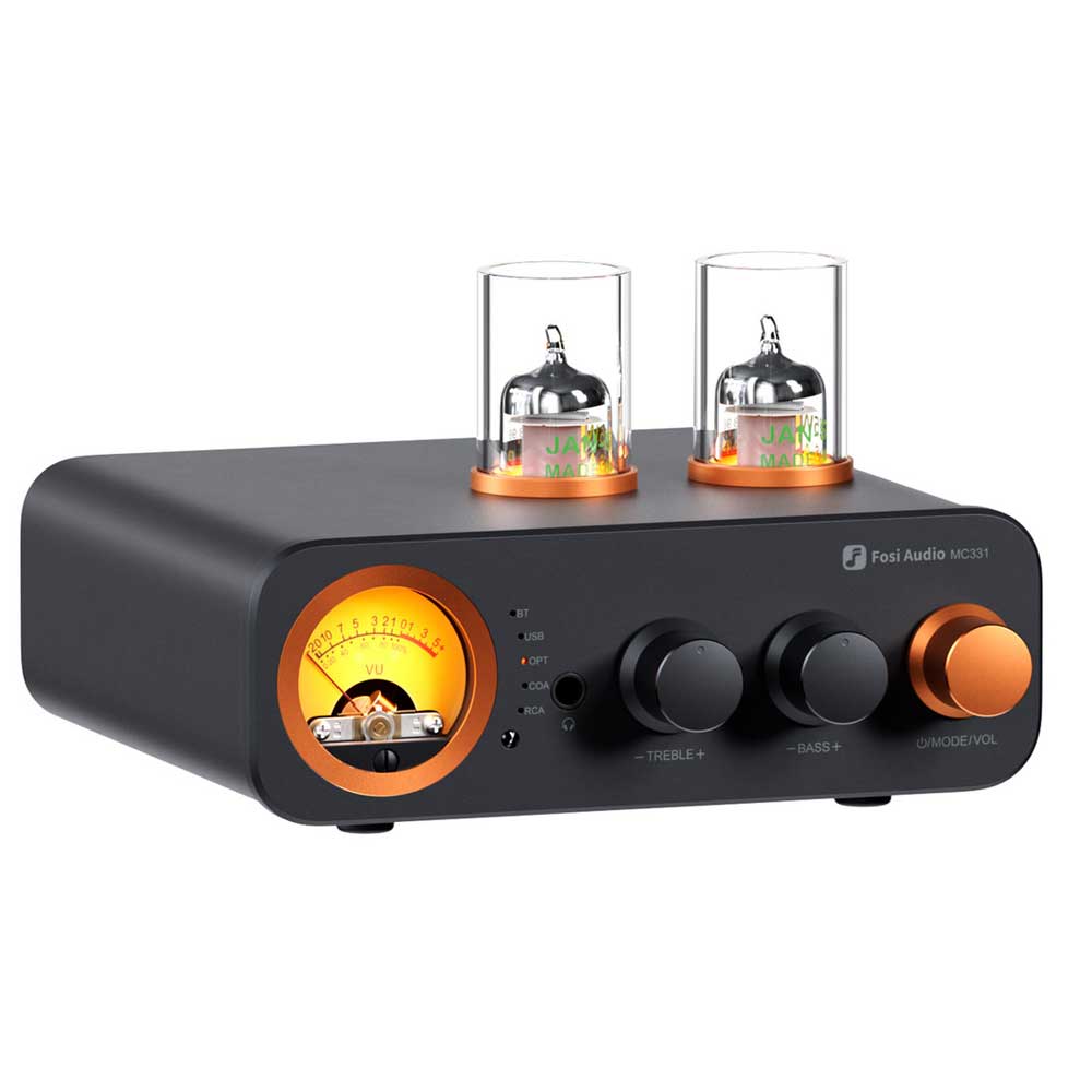 The Fosi Audio MC331 is a tube-enhanced integrated Bluetooth amplifier that blends warm, rich sound with modern wireless convenience.