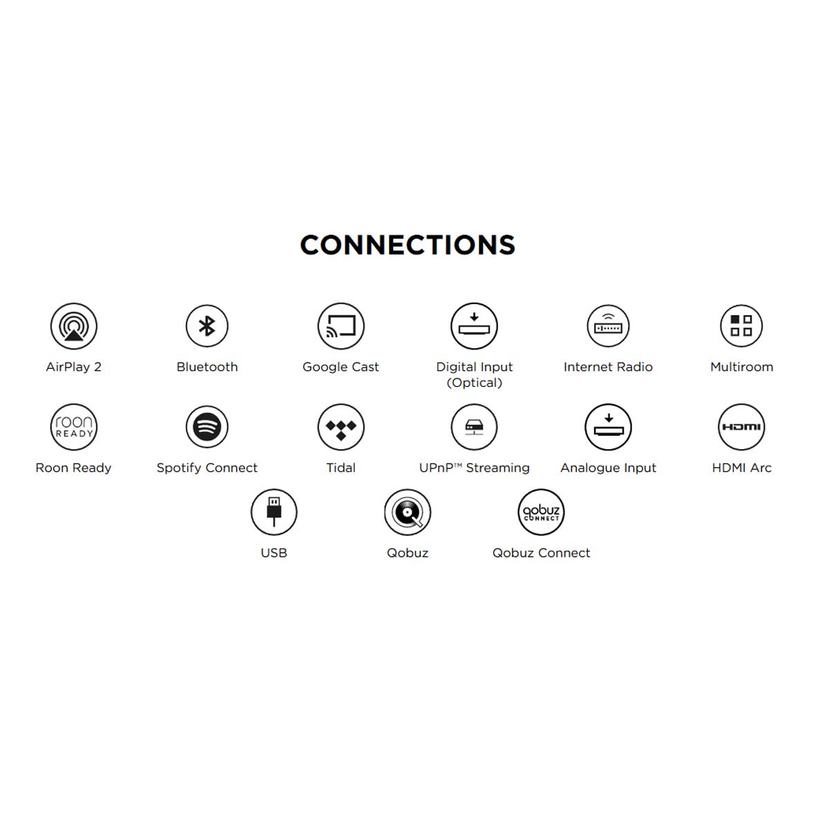 USB sticks – max. 128 GB. - Streaming – Stereo : Apple AirPlay 2, Bluetooth, Chromecast, Internet Radio, Qobuz, Roon Ready, Spotify®Connect, TIDAL, UPnP™