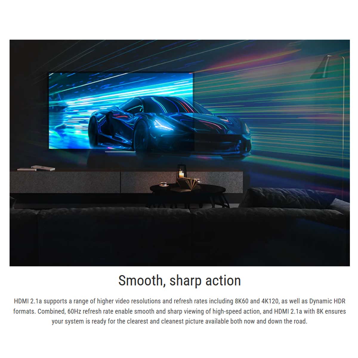 HDMI 2.1a supports a range of higher video resolutions and refresh rates including 8K60 and 4K120, as well as Dynamic HDR formats. Combined, 60Hz refresh rate enable smooth and sharp viewing of high-speed action, and HDMI 2.1a with 8K ensures your system is ready for the clearest and cleanest picture available both now and down the road.