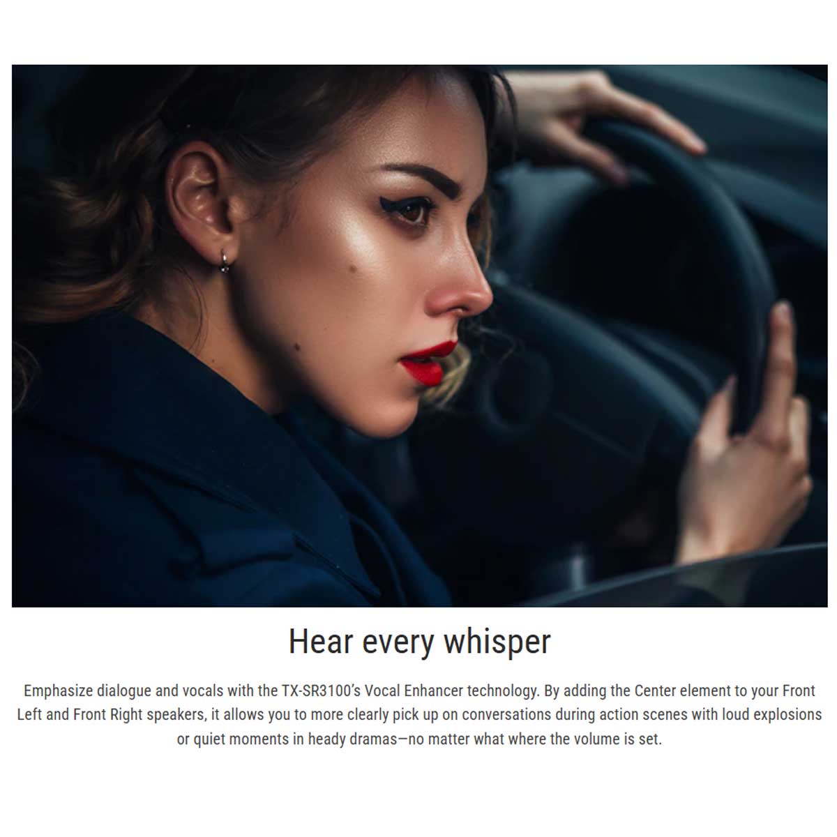 Emphasize dialogue and vocals with the TX-SR3100’s Vocal Enhancer technology. By adding the Center element to your Front Left and Front Right speakers, it allows you to more clearly pick up on conversations during action scenes with loud explosions or quiet moments in heady dramas—no matter what where the volume is set.