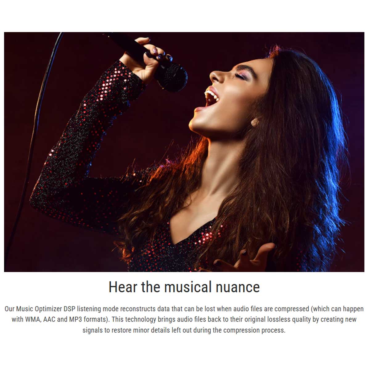 Our Music Optimizer DSP listening mode reconstructs data that can be lost when audio files are compressed (which can happen with WMA, AAC and MP3 formats). This technology brings audio files back to their original lossless quality by creating new signals to restore minor details left out during the compression process.