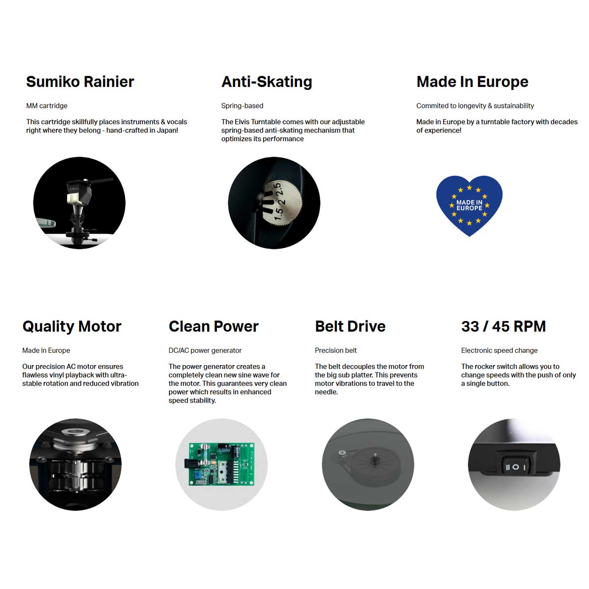 - Anti-Skating | Spring-based – The Elvis Turntable comes with our adjustable spring-based anti-skating mechanism that optimizes its performance