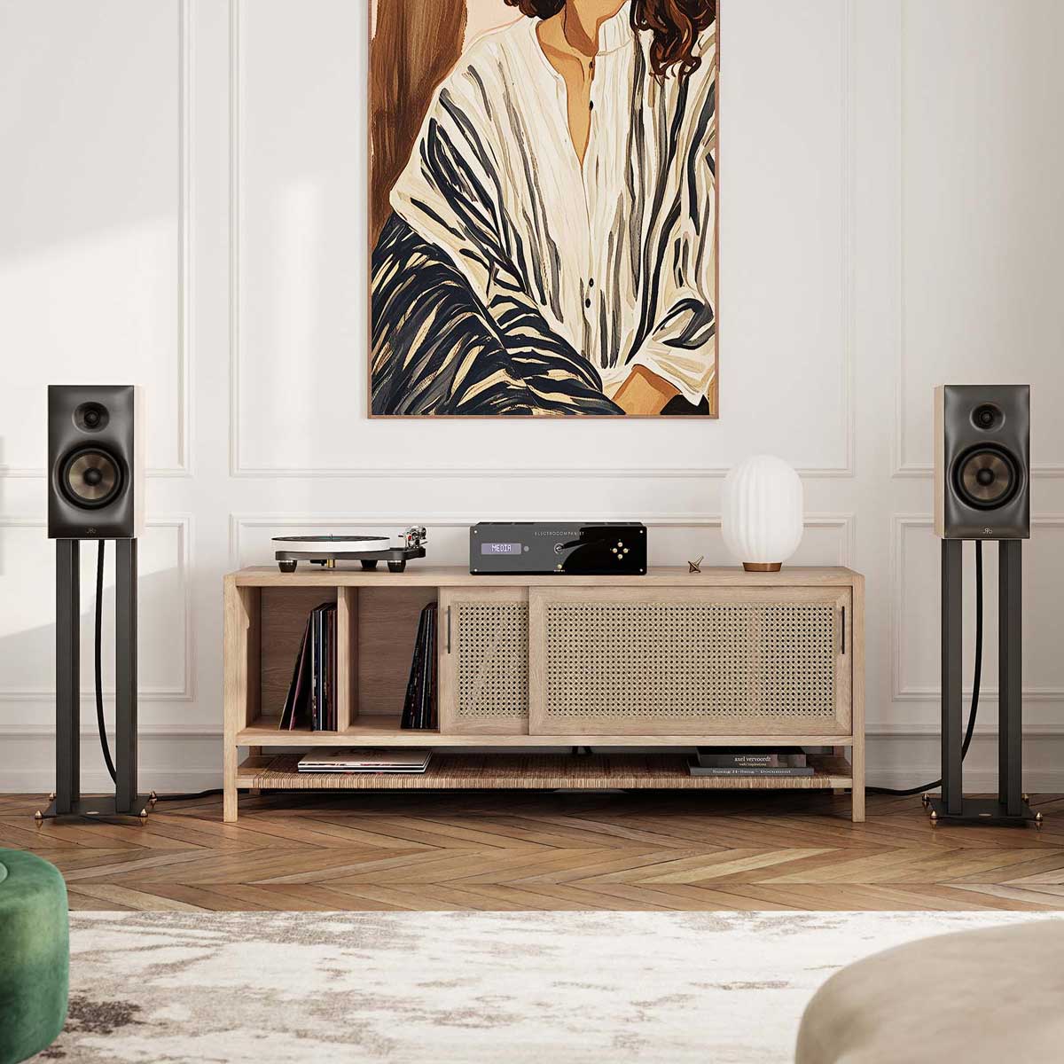 A carefully tuned two-way system delivers a balanced, natural sound with excellent clarity and imaging.