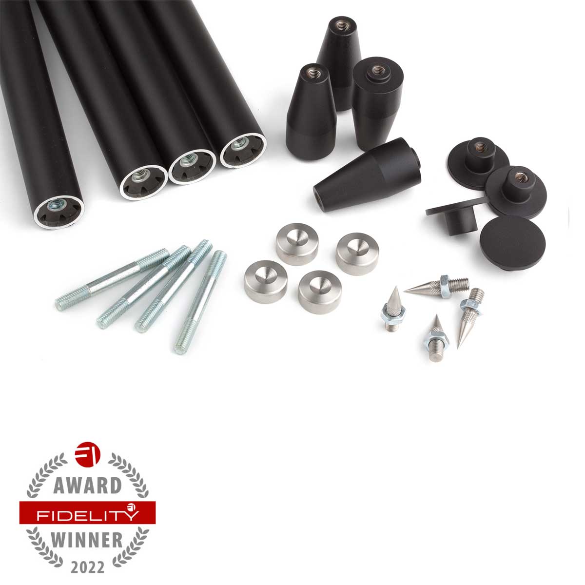 - Stainless steel: [Upper terminations], [Bottom terminations], [Adjustable spikes], [Protective floor discs (Pads)], [Adjustable Cones], [Screws].
