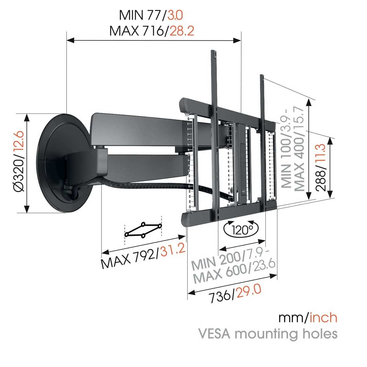 Can rotate up to 120° and extend up to approximately 72 cm from the wall, giving maximum positioning flexibility.