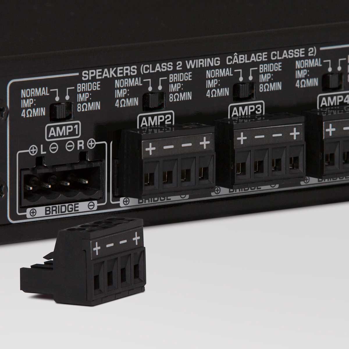 - Eight channels of audiophile-grade Class D amplification assignable to any zone, bridgeable and 4-ohm capable, featuring a unique ground loop/hum-free circuit design