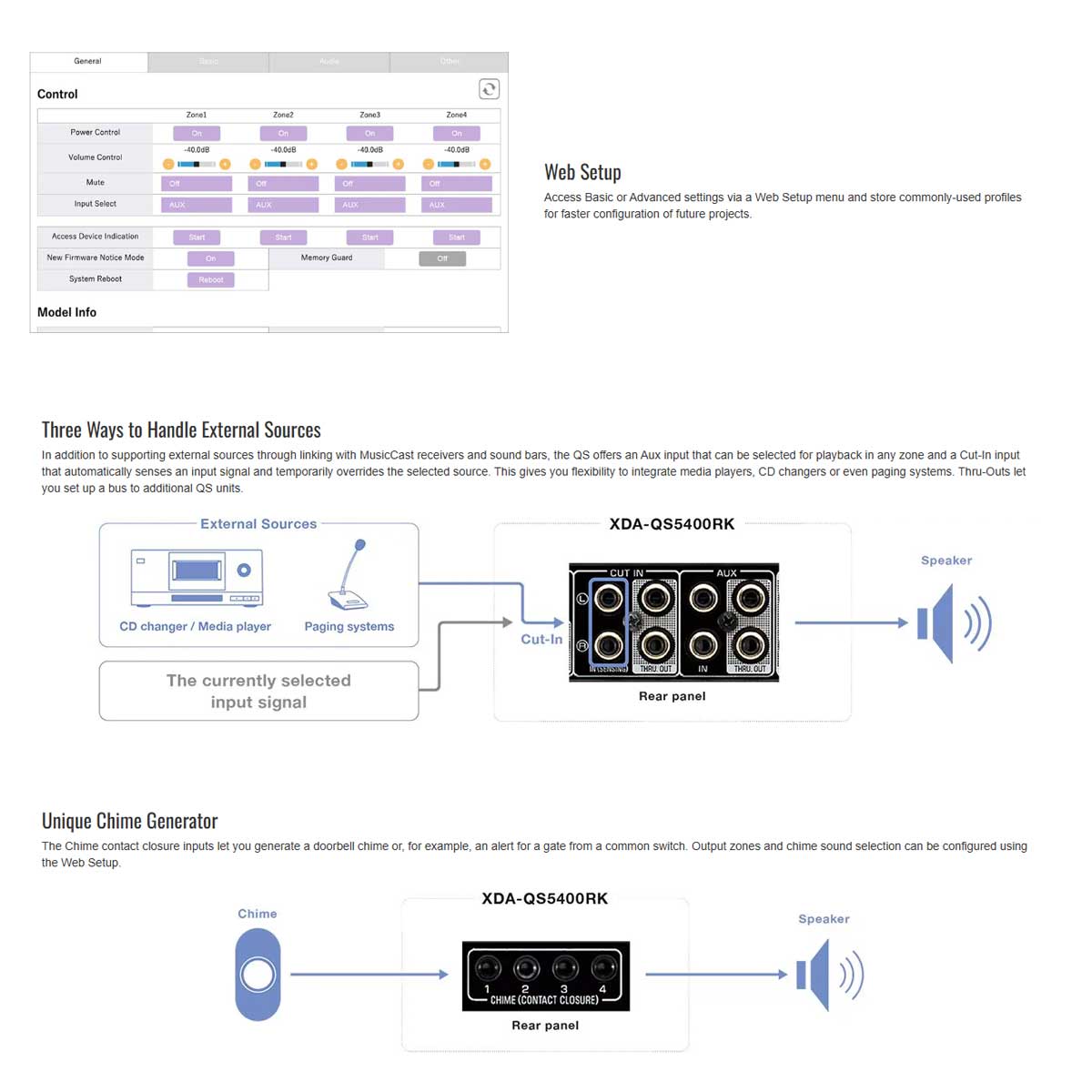The Yamaha XDA-QS5400 MusicCast Multi-Room Streaming Amplifier is specially designed for custom integration of whole home audio systems, the “QS” (Quad Streamer) provides four zones of audio streaming and eight channels of high-performance audio amplification in an ultra-slim, 1U-high, rack-mountable enclosure.